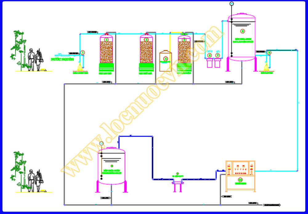 Nước thô đầu nguồn ⇒ Máy bơm trục ngang ⇒ Cột lọc số 1 ⇒ Cột lọc số 2 ⇒ Cột lọc số 3 ⇒ Lọc tinh ⇒ Bồn chứa inox ⇒ Bơm trung gian trợ áp ⇒ Bơm trục đứng cao áp ⇒ Màng lọc RO 4040 ⇒ Đèn UV diệt khuẩn ⇒ Nước Đạt QCVN
